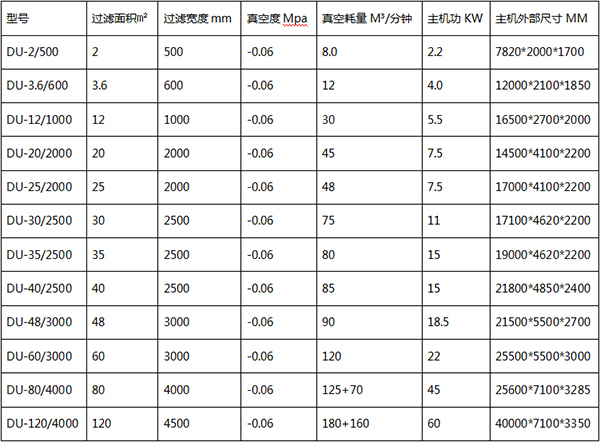 DU橡膠帶式真空過(guò)濾機(jī)參數(shù)表:(部分規(guī)格):
